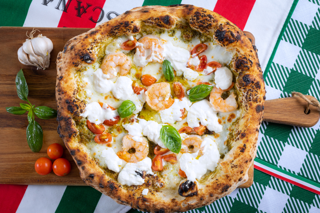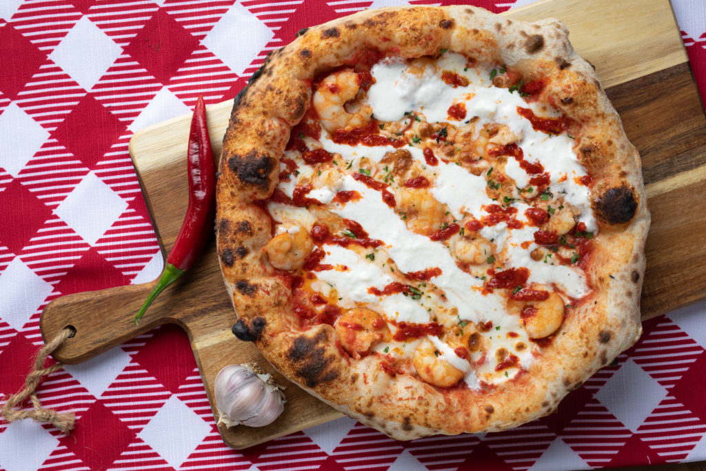 San Marzano tomato, prawns, stracciatella cheese, fior di latte, fresh chilli, garlic & parsley